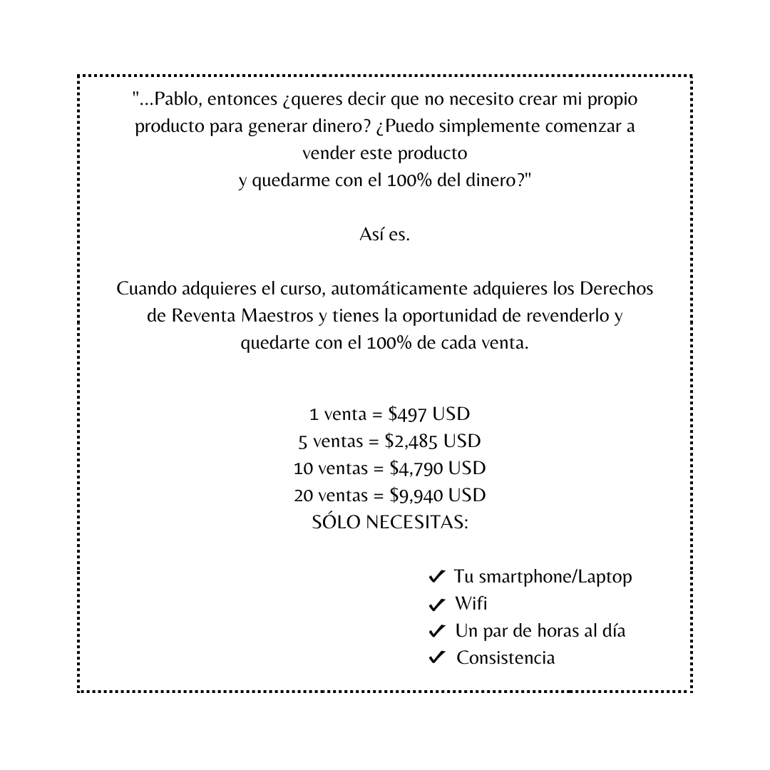 Lo que a mí me atrapó de este curso es que incluye Derechos de Reventa Maestros (Master Resell Rights en inglés).