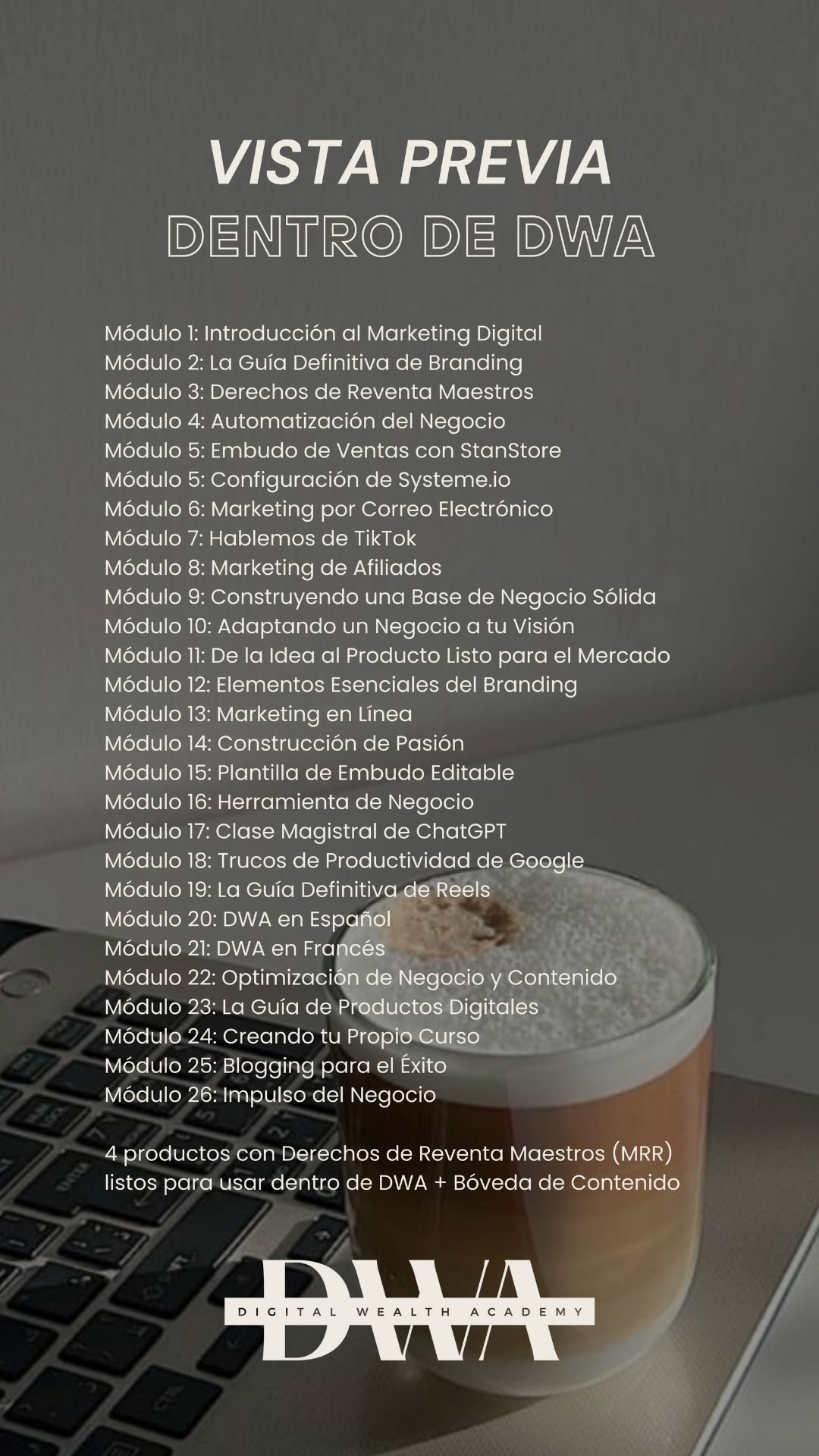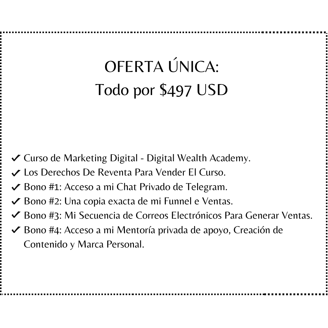 Este producto es un curso paso a paso de Marketing Digital. Tiene 10 módulos con más de 100 videos que te ayudarán a crear tu propio negocio de marketing digital. Además, una vez compras el curso también adquieres los derechos de reventa (MRR en inglés). En otras palabras, el curso se vuelve tuyo y lo puedes vender las veces que quieras y quedarte con el 100% del dinero.